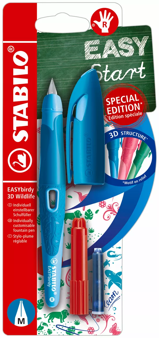 Der STABILO EASYbirdy 3D Wildlife mit tierischen Motiven.Erster STABILO Schulfüller ab 7 Jahren in ergonomischem Design speziell für Rechtshänder. Kappenmodell. Griffzone aus rutschfestem Material. 3 angesagte Farbkombinationen für Rechtshänder. Feder für die individuell beste Handhaltung in 3 Winkeln einstellbar inkl. Werkzeug, Art der Schreibflüssigkeit: Tinte auf Wasserbasis. Feder in Standard-Härte M. Enthält 1 Patrone königsblaue löschbare Standard Schultinte. Nachfüllbar mit 1 Grossraumpatrone oder 2 kleinen Standardpatronen. 2 Sichtfenster zur Tintenstandkontrolle.
