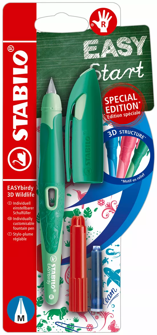 Der STABILO EASYbirdy 3D Wildlife mit tierischen Motiven.Erster STABILO Schulfüller ab 7 Jahren in ergonomischem Design speziell für Rechtshänder. Kappenmodell. Griffzone aus rutschfestem Material. 3 angesagte Farbkombinationen für Rechtshänder. Feder für die individuell beste Handhaltung in 3 Winkeln einstellbar, Art der Schreibflüssigkeit: Tinte auf Wasserbasis. Feder in Standard-Härte M. Enthält 1 Patrone königsblaue löschbare Standard Schultinte. Nachfüllbar mit 1 Grossraumpatrone oder 2 kleinen Standardpatronen. 2 Sichtfenster zur Tintenstandkontrolle.
