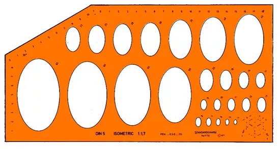 - Ellipsenschablone mit isometrischen Achsen, 4-65 mm, Achsverhältnis: 1:1.7(35°16')