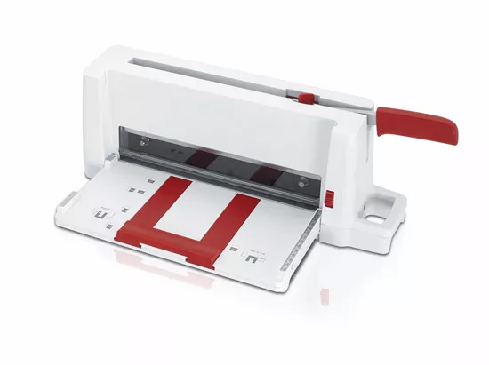 - Massicot de bureau ultra-compact, transportable et spécialement conçu pour la découpe de petits formats.