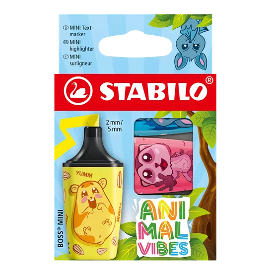 - La collection STABILO Animal Vibes comprend des mini-versions colorées et ludiques des produits STABILO les plus populaires, en édition limitée. Le surligneur STABILO BOSS MINI de cette série est disponible en cinq couleurs fluo avec d'adorables motifs d'animaux. Ce lot de 3 comprend les couleurs rose – suricate (56), bleu – chauve-souris (31) et jaune – hamster (24).