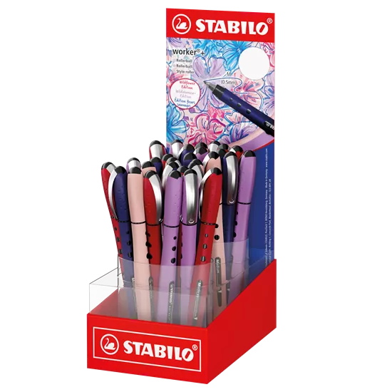 - Le rollerball STABILO worker+ medium NatureCOLORS Wildflower haut de gamme est disponible en quatre couleurs vives et modernes inspirées de la nature : rouge bordeaux, bleu de Prusse, violet grisâtre et rose pâle.